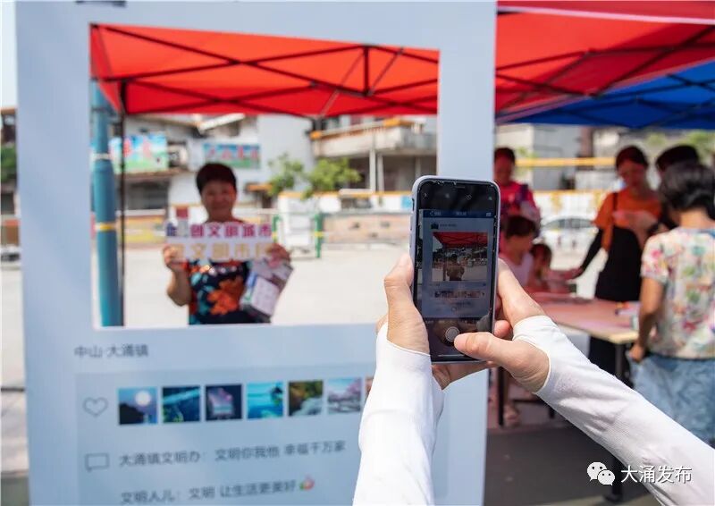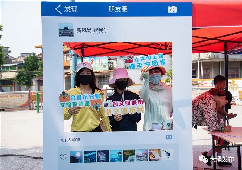在“朋友圈”拍照留影墙前,各年龄段的市民争相上前合影并分享到朋友圈,传递文明新风尚。摊位内还展示了大涌镇开展文明城市创建、新时代文明实践建设工作成果,让市民进一步了解、支持、参与创文工作。现场还设有志愿者注册登记服务等宣传引导。
