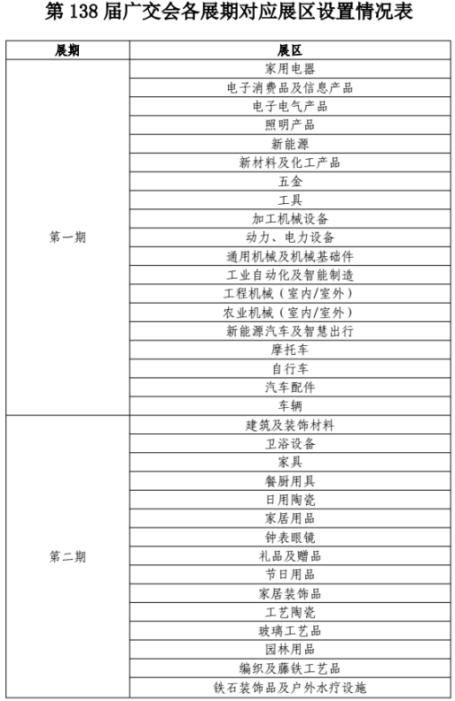 第138届广交会计划于2025年10月15日开幕,分三期举办线下展,其中: