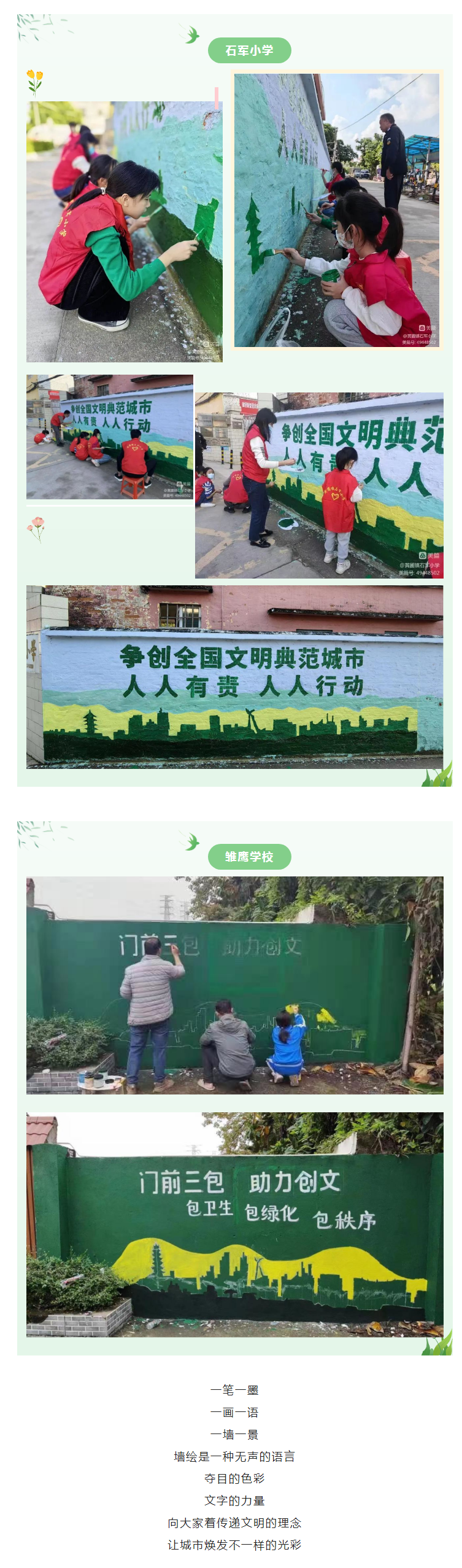 文明,是一个城市最深处的灵魂,它凝结着城市的内在气质,赋予了城市源源不断的发展动力。近日,为争创全国文明典范城市,营造浓郁的文明创建氛围,黄圃镇中小学积极响应,组织广大师生、家长化身“墙绘师”,开展争创全国文明典范城市新时代文明实践墙绘活动,把“文明”色彩绘在墙上、嵌在心上,共绘“文明黄圃”美丽画卷,成为文明创建路上的美丽风景。