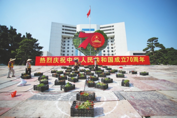 Staff members were arranging the flower sculpture in front of the office building of the Zhongshan Municipal People's Congress and Zhongshan Muicipal Committee of CPPCC on September 24. [Photo by Yang Weijian]