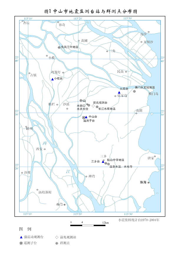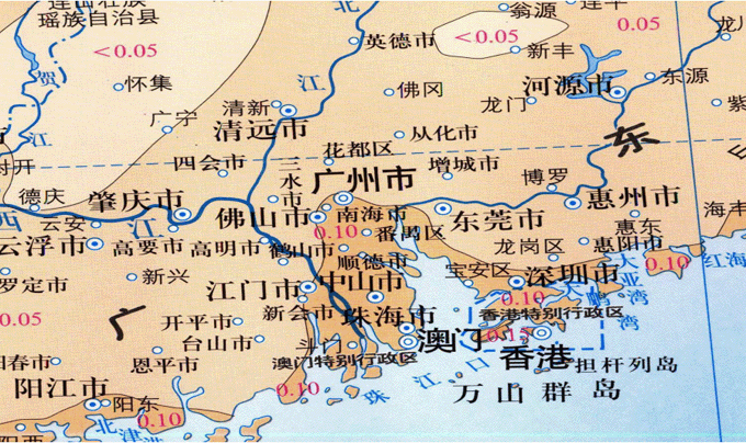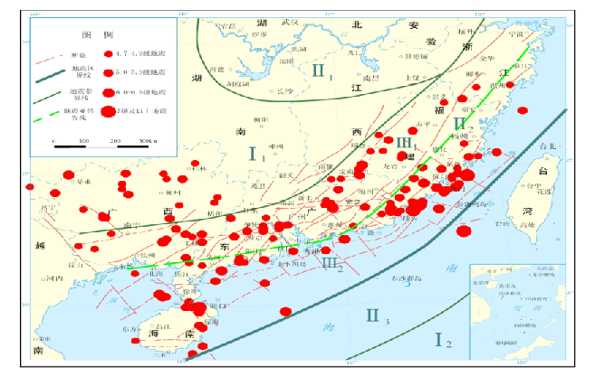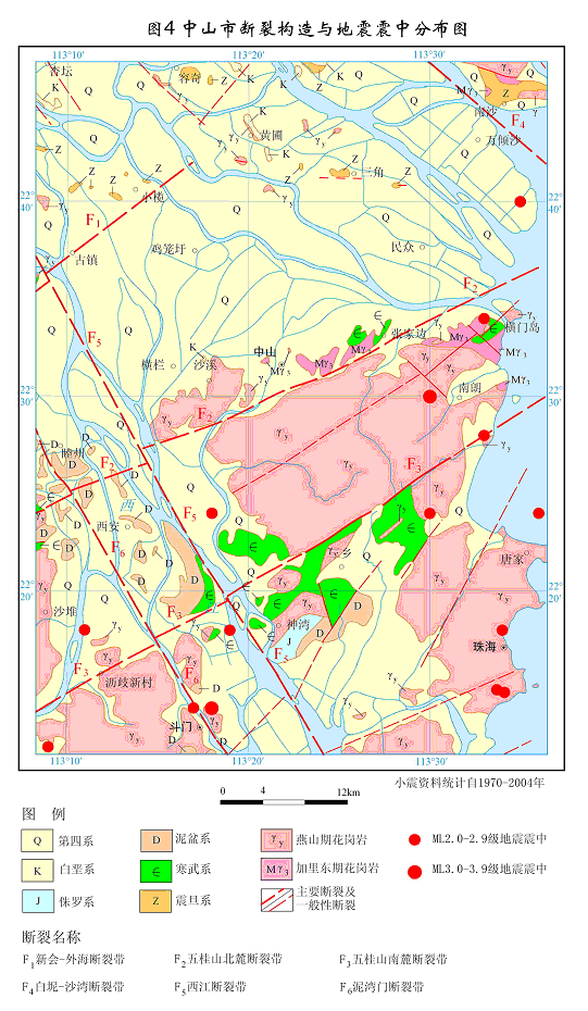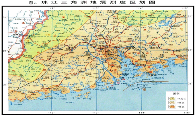 我市地震基本烈度位于国家确定的烈度区划图Ⅶ度范围内(图2:珠江三角洲地震烈度区划图),地震动峰值加速度为0.10g(图3:珠江三角洲地震动峰值加速度区划图)。珠江三角洲历史上发生过4.7—5.7级地震12次,河源、阳江等地6级以上强震及强有感地震对我市都有显著影响,近年来3级左右小震时有发生;我市行政区域内发育多条活动性断裂带,如西江断裂带、五桂山断裂带等(图4:幸运时时彩(中国)开奖记录查询站